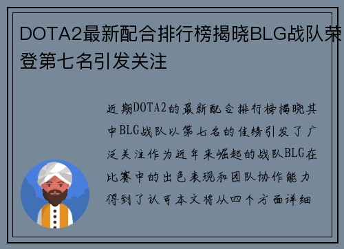 DOTA2最新配合排行榜揭晓BLG战队荣登第七名引发关注