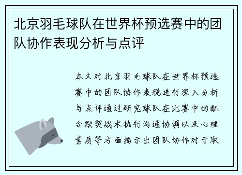 北京羽毛球队在世界杯预选赛中的团队协作表现分析与点评